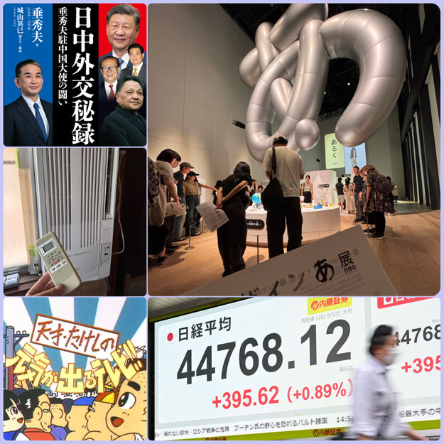 夏バテを見兼ねた友人が「中古だけど」とエアコンを設置してくれた。二部屋続きの間、ビンビン冷え冷えは兎も角、除湿効果はありがたい。そして秋本番、倦怠&ボケの防止にと年内の目標を掲げてみた。薦められた本を読む、国内と海外へ旅行、小学の同窓会、脂肪腫の除去手術の四つだ。その前段にと先日「デザイン〈あ〉展」に上がったが不完全燃焼に終わった。一方で景気のいい話が日経12日、44,768円の史上最高値。しかしTV「天才たけし」、あの1989年バブル期(38,915円)のような元気・イケイケ感がまったく無い。海外投資家と円安に操られた株高、トランプの「ババ」を引くのは御免だね。