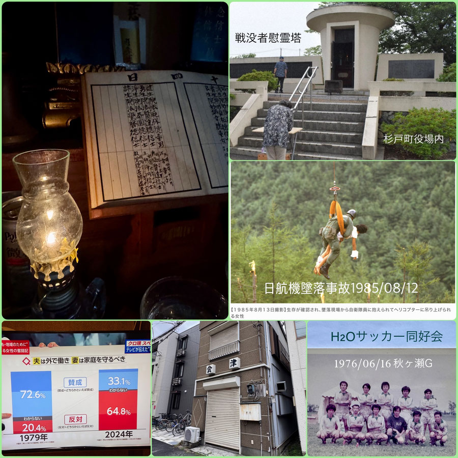 ご先祖を迎え供養するお盆。「十三代総領も、何とかやってるようだ」と先代から及第点を貰えただろうか?時代が移っても八月の風景は生きている。圧倒的な軍備力の米英に戦争を仕掛けた日本陸海軍の無謀、負け戦承知の太平洋戦争で350万もの兵士民間人の命が奪われたことを知った。町内の慰霊碑には出兵戦死・空襲死した430の名前が刻まれている。そして自分の記憶の八月は「会津」だ。その奥座敷でサッカー仲間との暑気払い中、TVで「日航機交信途絶」(後にジャンボ機墜落520名死亡・4名生存)を知った。あれから40年、同年に授かった第三子が今、立派なパパとなっている。健康と平和に合掌!