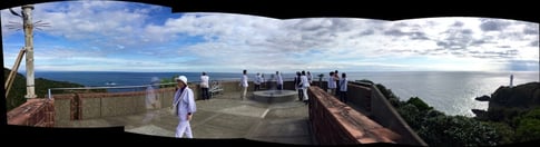 さて三七番が打ち始め。ズズズイーっと走って四国最南端の足摺岬で昼メシ。思い出に、中浜(ジョン)万次郎の像を背にパチリ。太平洋を望み、絶景かな絶景かな〜。