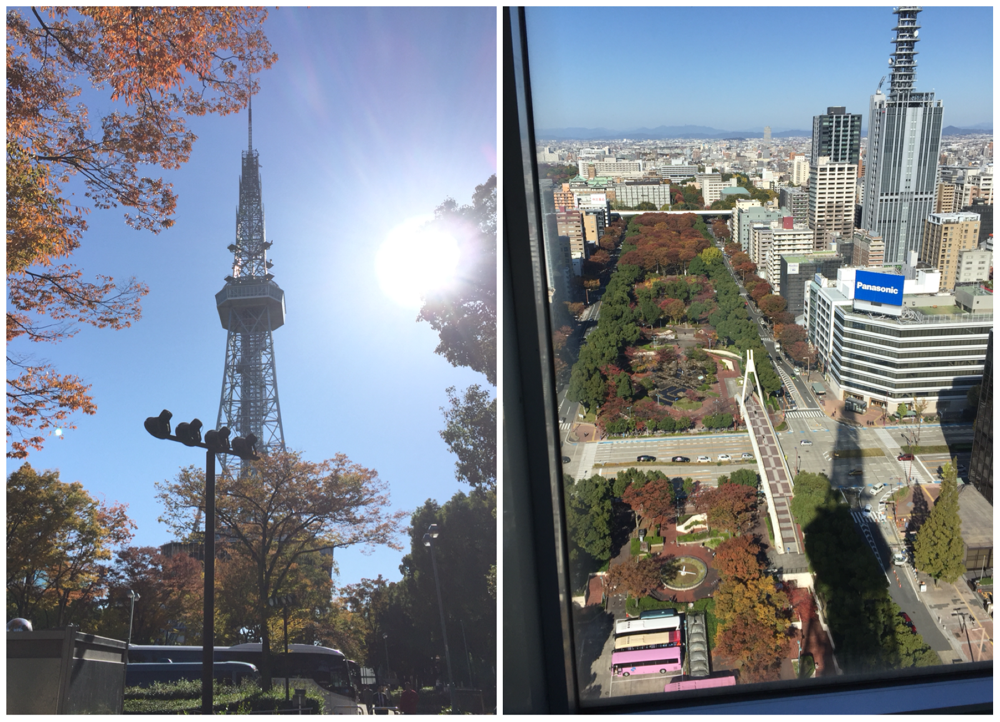 腹ごなしを兼ねてホテルの在る丸の内から名古屋テレビ塔までえっちらおっちら。ピーカンのポカポカ天気、冷たいビル風に時折撫でられルンルンの足取りだ。紅葉の久屋大通りに名古屋のシンボルが光る。暇に任せて七百円を塔に投資。やはり上からの展望は流石だ。