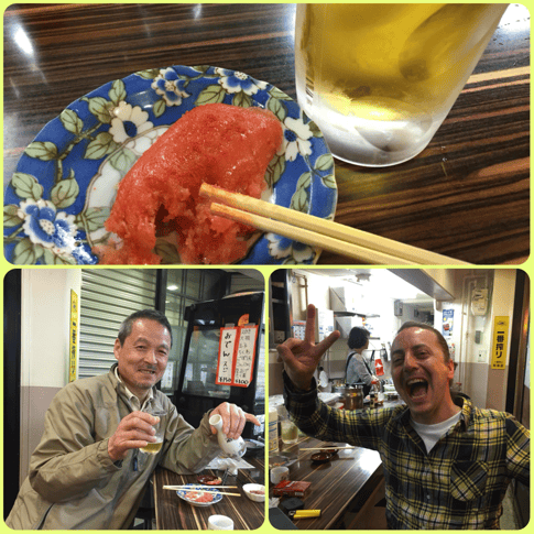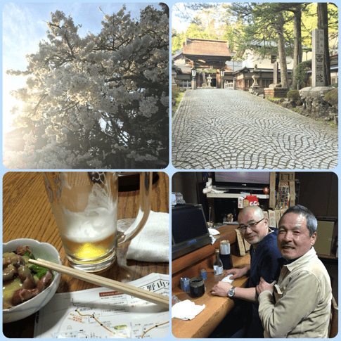 そんで肝心なのが明日に向けてのセレモニー、般若湯である。焼き鳥の店には団体が入り嫌われたので、路地の先にあるシブイ地元ピープル御用達の寿司屋へ。肴を3種のお湯で流した後、お坊さんが来店しツーショットを撮ってもらったようだが、あまり覚えがない。